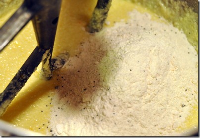 Then combine your dry ingredients; three cups of flower, a teaspoon and a half of baking powder and salt, and three tablespoons of poppy seeds.![]()
