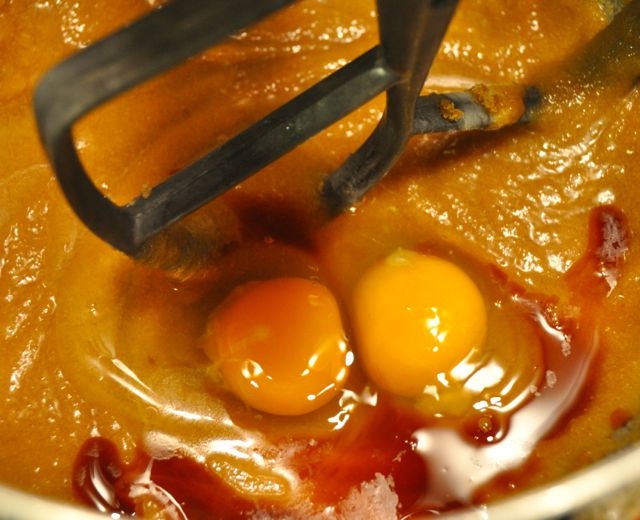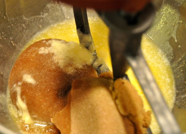 You start by creaming together two sticks of melted butter and two cups of brown sugar.